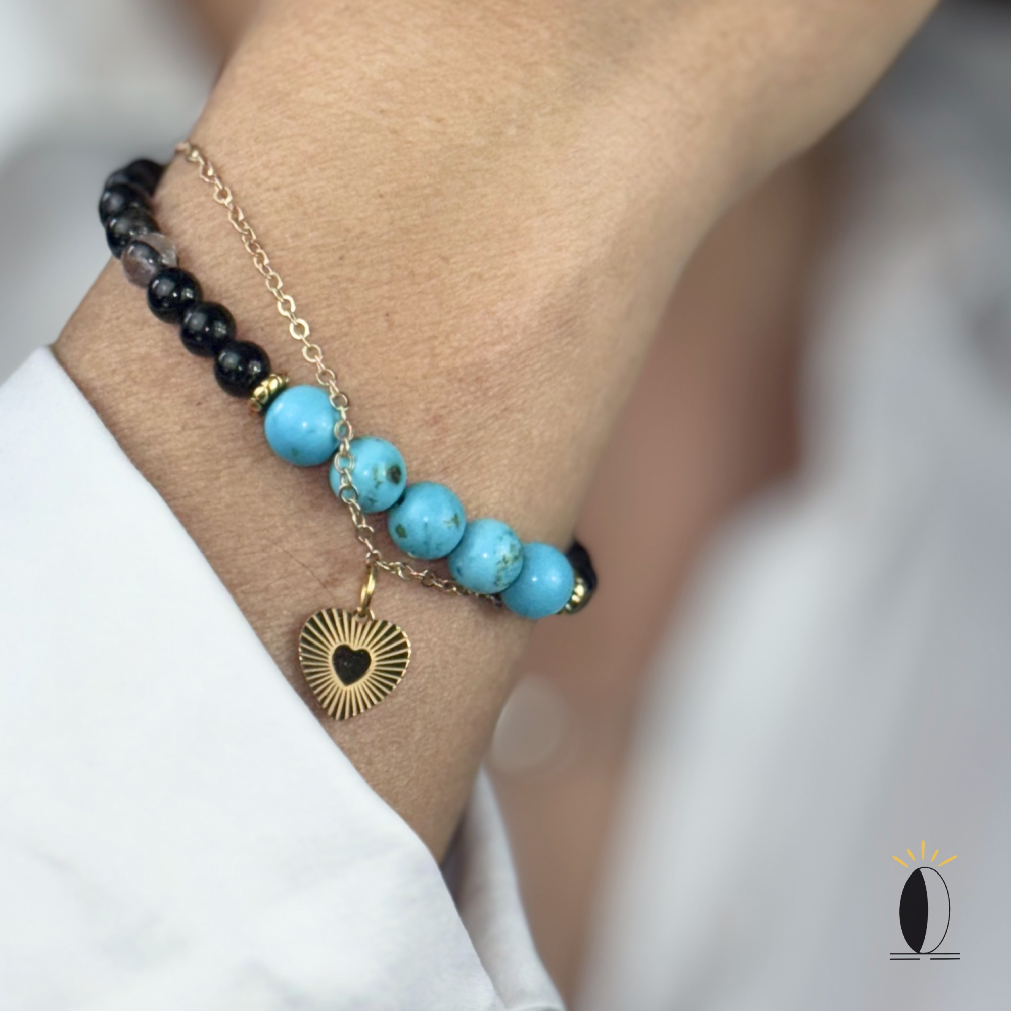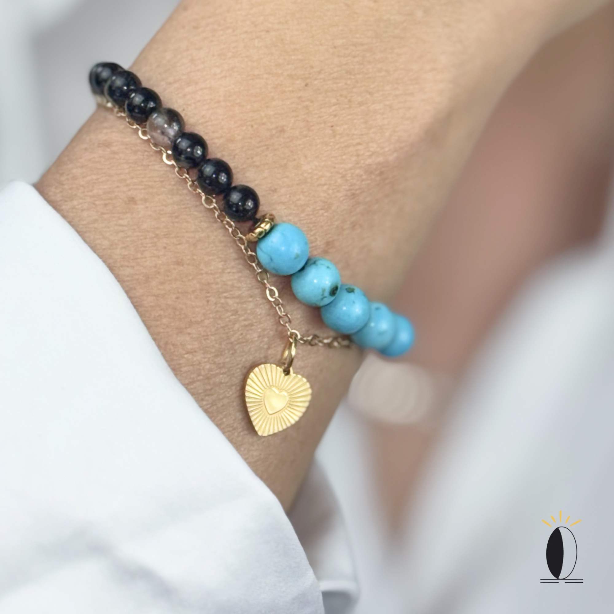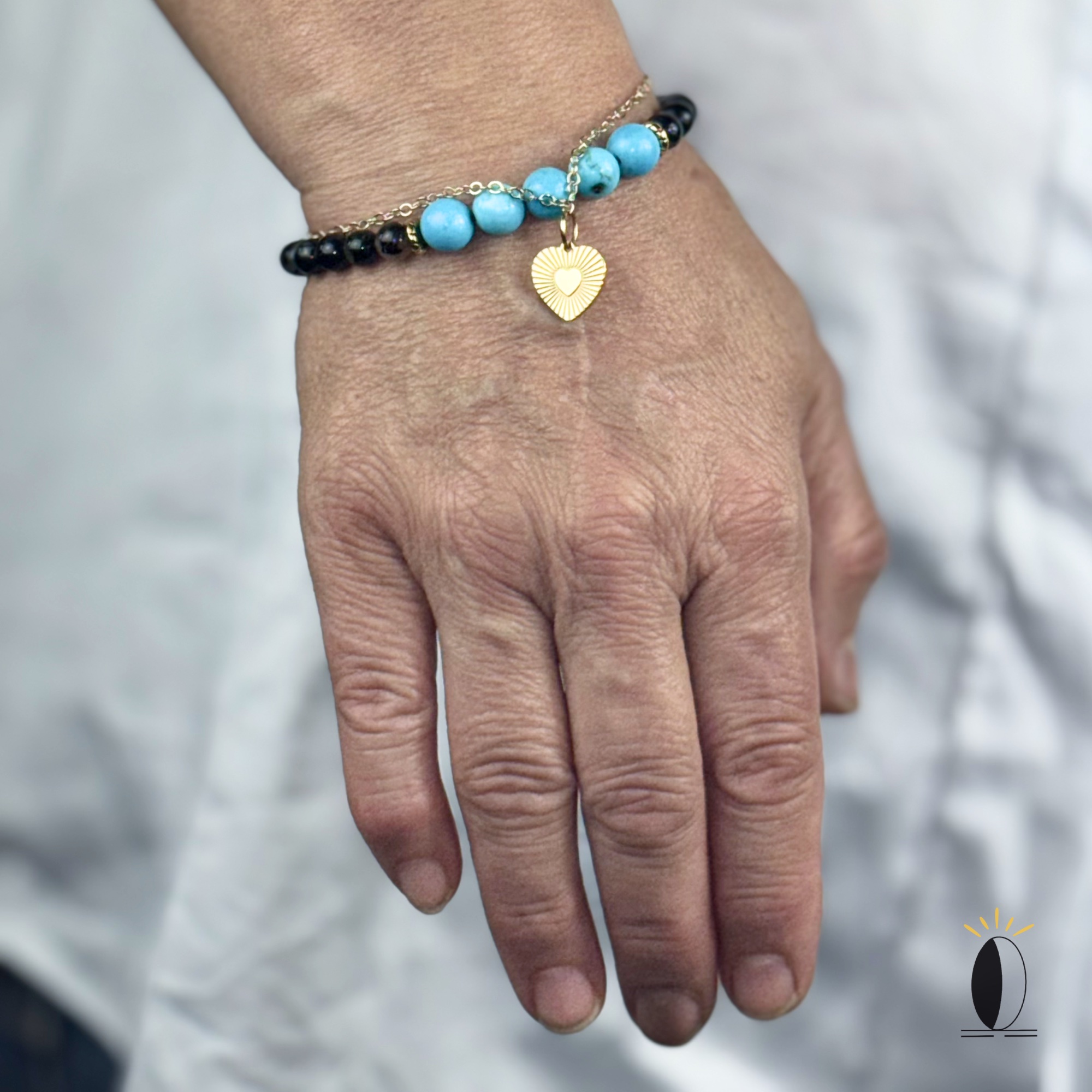 Ta piękna bransoletka to harmonijne zestawienie 5 kulek turkusu (8 mm) oraz 16 kulek turmalinu (6 mm). Całość dopełnia Łańcuszek wykonany z mosiądzu, zapięcie ze stopu metali pozłoconego oraz dekoracyjna zawieszka serce wykonany ze stali nierdzewnej. Kamienie są naturalne, a elementy metalowe zostały zaprojektowane tak, by współgrać estetycznie i trwałości .