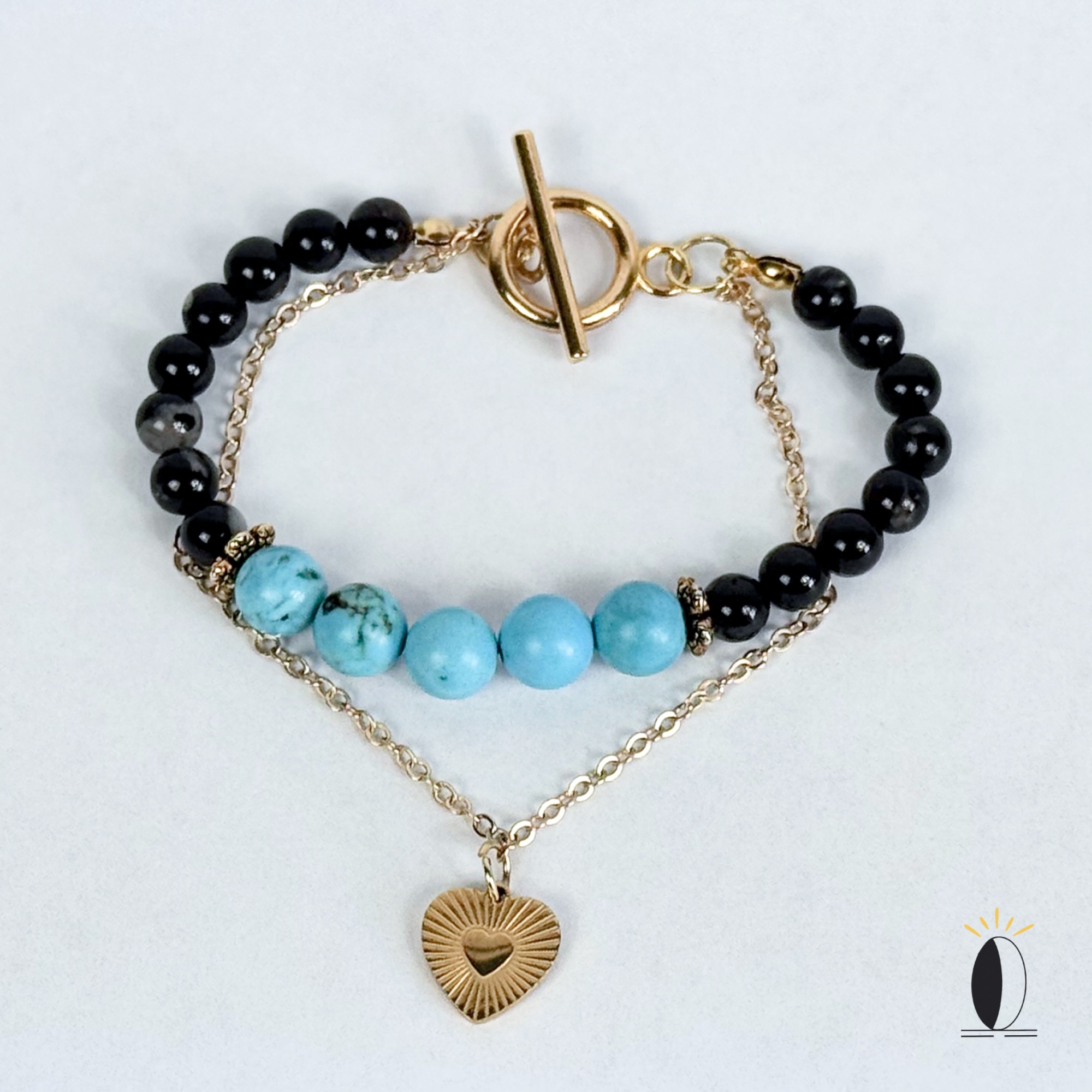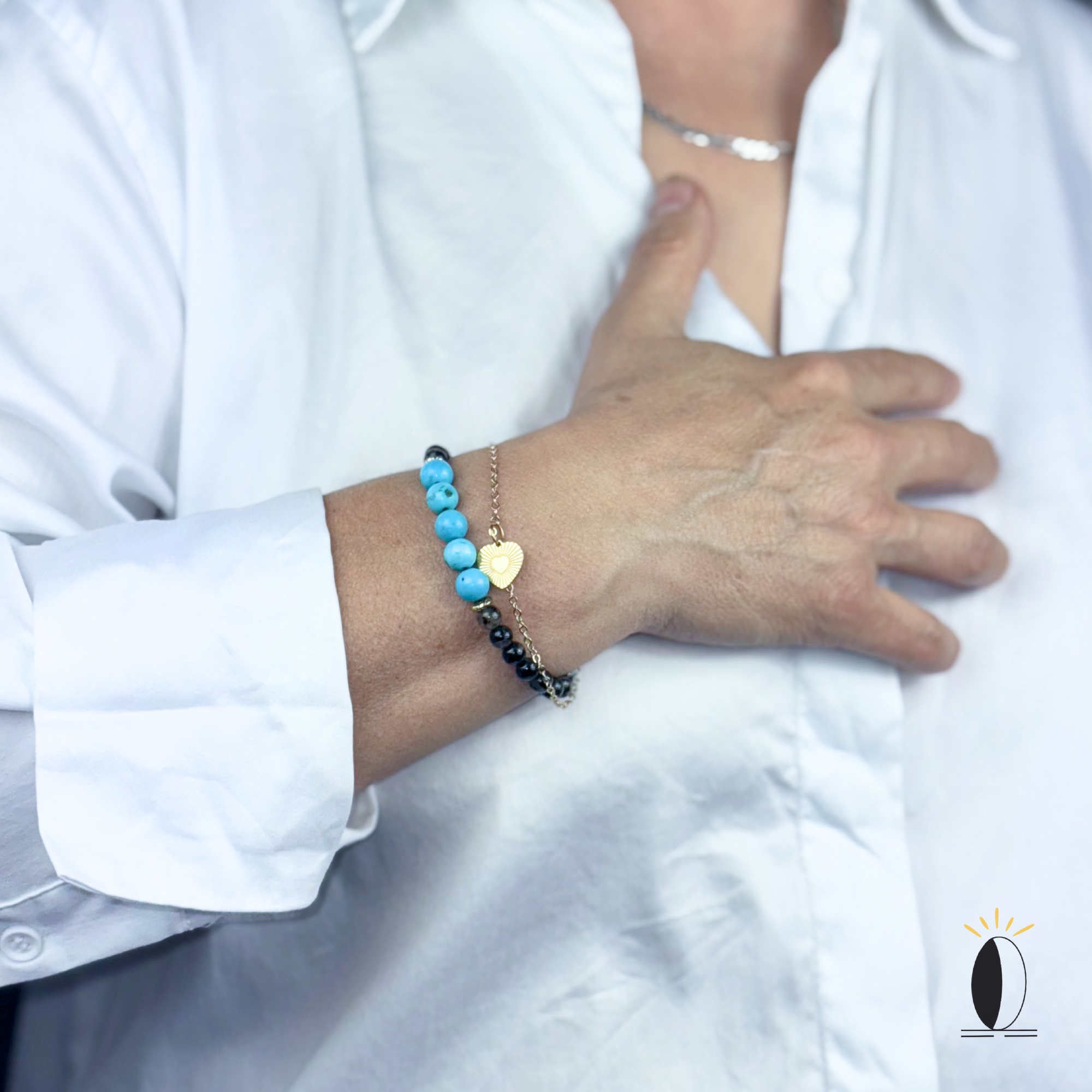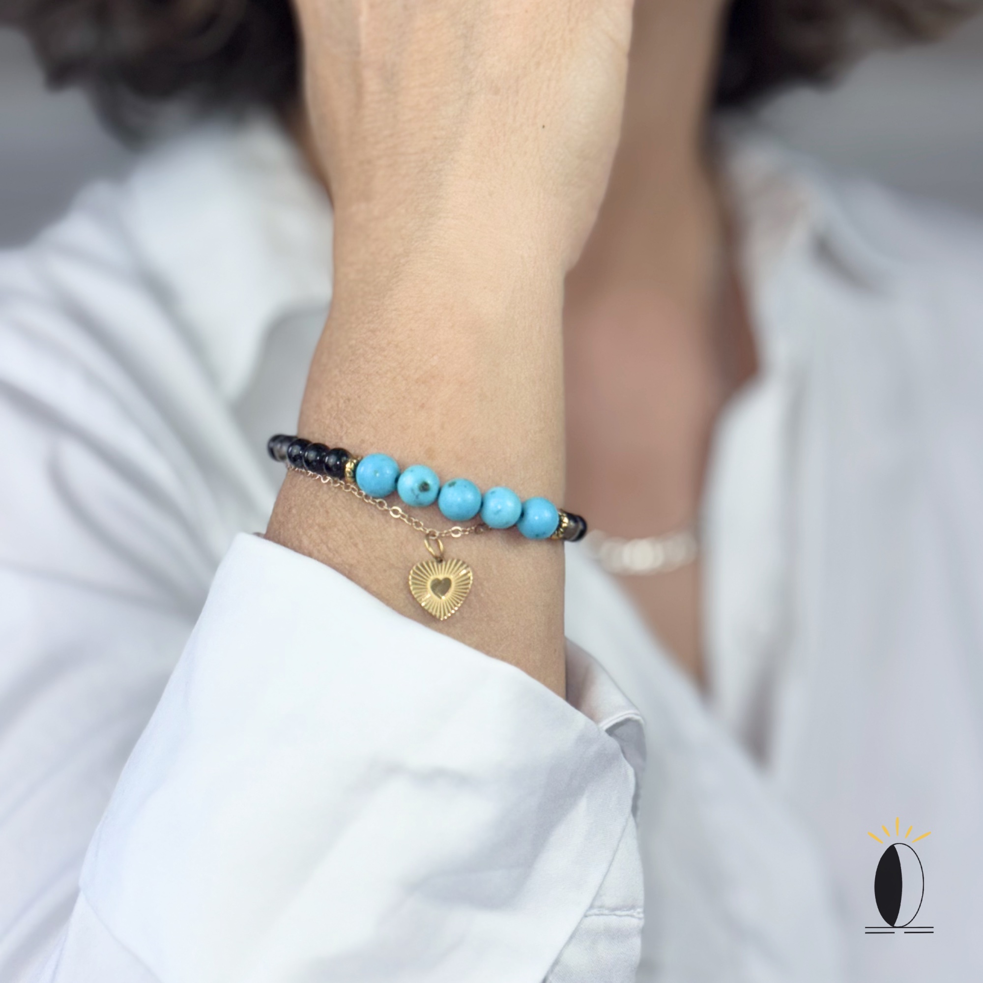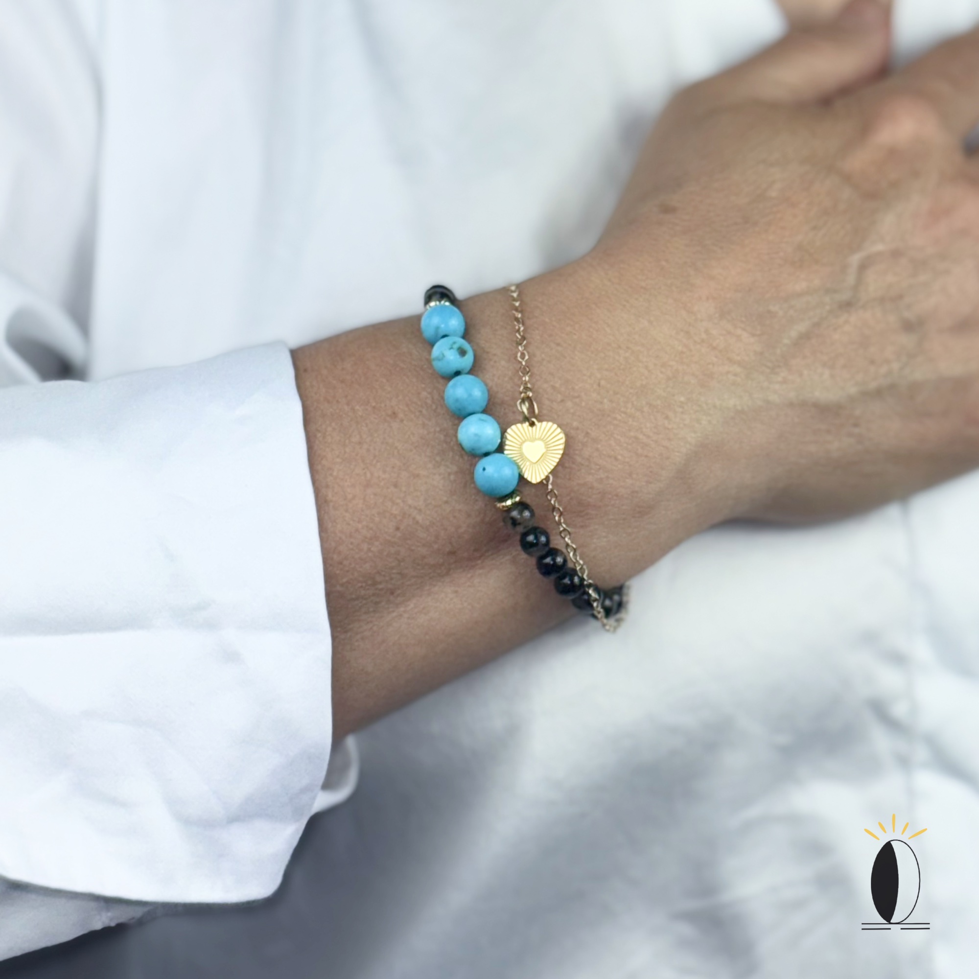Ta piękna bransoletka to harmonijne zestawienie 5 kulek turkusu (8 mm) oraz 16 kulek turmalinu (6 mm). Całość dopełnia Łańcuszek wykonany z mosiądzu, zapięcie ze stopu metali pozłoconego oraz dekoracyjna zawieszka serce wykonany ze stali nierdzewnej. Kamienie są naturalne, a elementy metalowe zostały zaprojektowane tak, by współgrać estetycznie i trwałości .